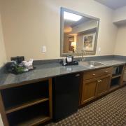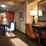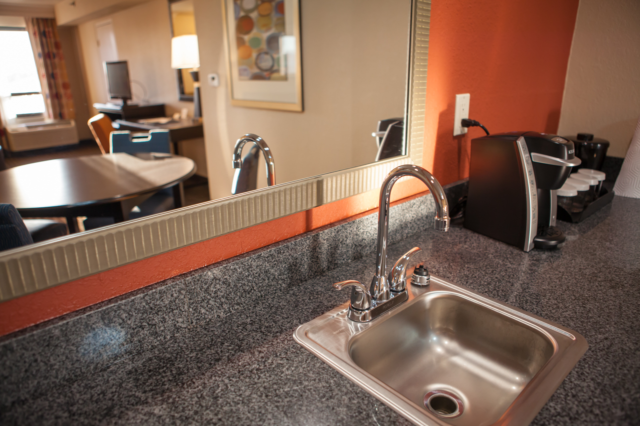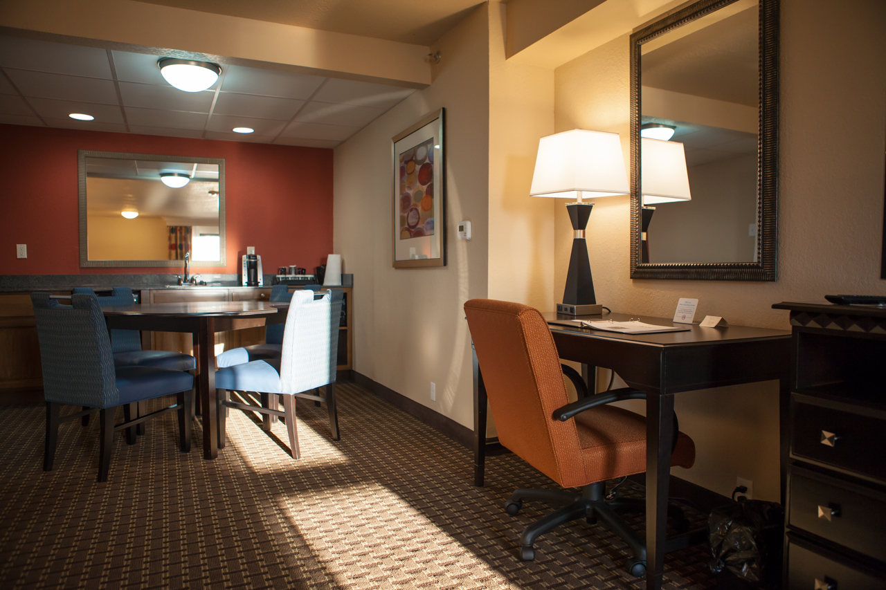 The Governors Suite is a luxurious two-room suite with a contemporary look planned for a comfortable stay. The living room area offers a queen-size sleeper sofa and chair, microwave, Keurig coffee maker, a mini-refrigerator, granite counter space, and table with four chairs. The bedroom has a king-size bed with plush-top mattress. Enjoy the oversized desk and complimentary wireless internet access or just relax in comfortable seating while watching your favorite shows on the 2 LED flat screen TVs.