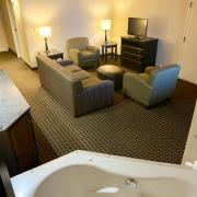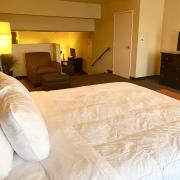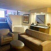 The Stephen Decatur Suite is a luxurious bi-level designer suite with a contemporary look planned for a comfortable stay. The upper level holds a king-size bed with a plush-top mattress. The lower level has a sitting area with pull out sleeper sofa, non-stocked wet bar, Keurig coffee maker, microwave, mini-refrigerator, and a two person whirlpool tub. The newly-designed bathroom offers two sinks with granite counter tops and lots of space to prepare for your day. Enjoy the oversized desk and complimentary wireless internet access or just relax in the comfortable seating while watching your favorite shows on the 2 LED flat-screen TVs.