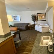 The Honeymoon Suite is a luxurious two-room suite with a modern look, perfect for a relaxing, romantic getaway. The living room area offers a queen-size sleeper sofa and chair, microwave, mini-refrigerator, non-stocked wet bar with granite counter space, a Keurig coffee maker, and a two-person whirlpool tub. The bedroom is furnished with a plush-top king-size […]